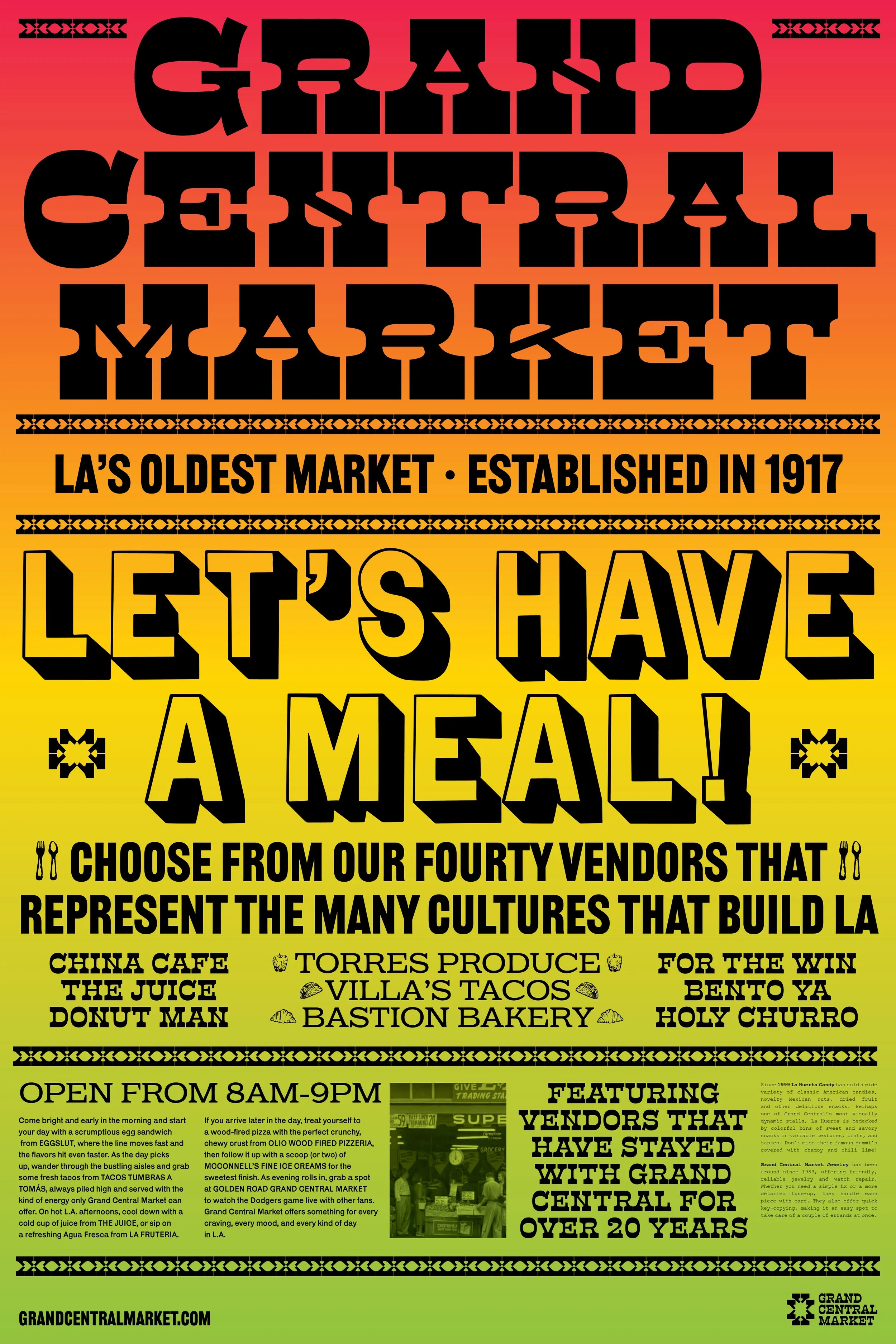 A rebrand of LA’s largest public market, Grand Central Market. With 4o vendors and over 100 years of business, they currently lack a brand positioning that aligns with the history, diversity, culture, and energy of the place. Influences from Colby Printing Studio and old historical prints help develop a visual identity that utilizes bold typefaces, and vibrant colors to encapsulate the brand.